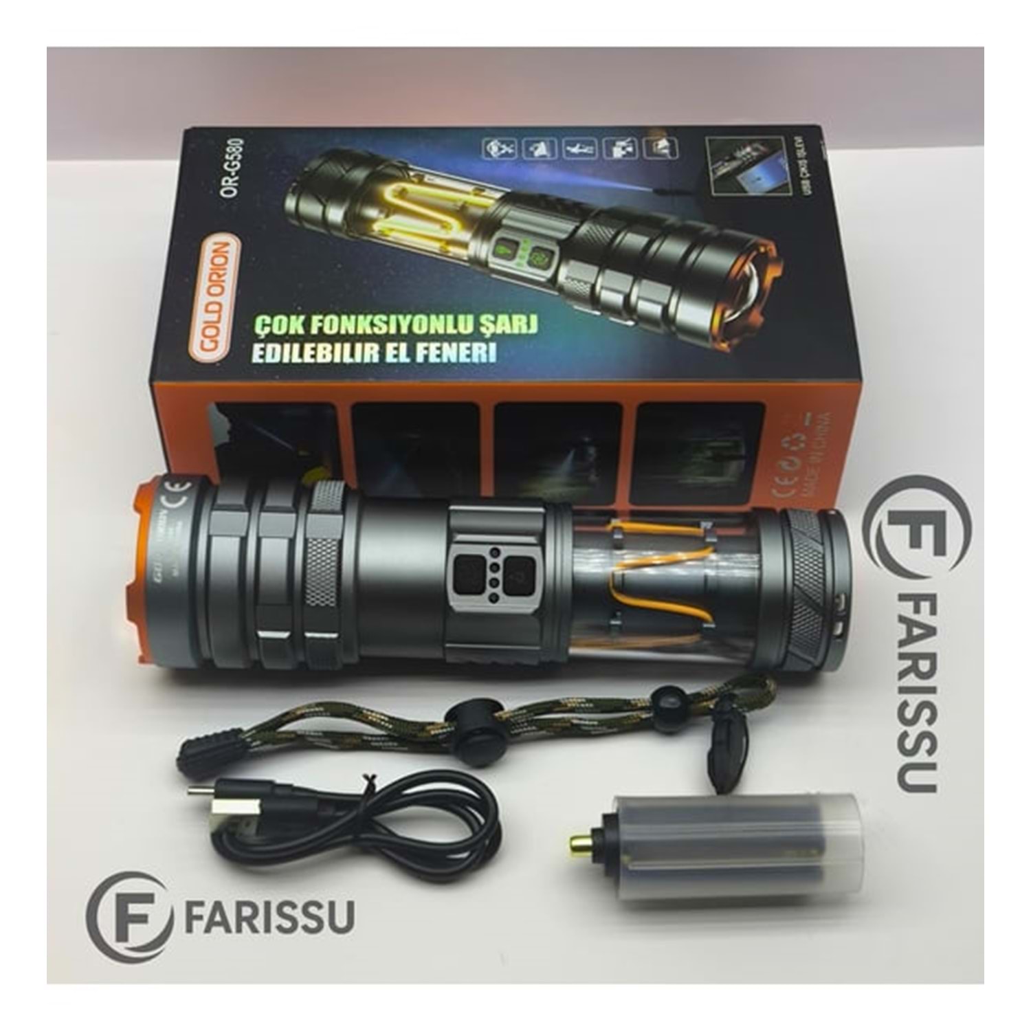Kutu İçeriği GOLD ORION OR-G580 Şarj Edilebilir El Feneri Şarj Kablosu Taşıma İpi Pil Taşıyıcı Adaptör Bu çok fonksiyonlu cihaz, zorlu koşullarda güvenilir ve etkili bir aydınlatma kaynağı arayanlar için mükemmel bir seçimdir.